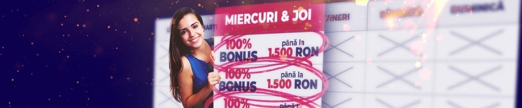 Doar în zilele de miercuri și joi, cel mai mare operator de jocuri de casino din România, MAXBET, oferă jucătorilor care folosesc platforma online un pachet de bonusuri care poate ajunge la 2500 de lei în fiecare zi!