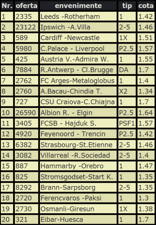 IMPORTANT: Dacă vrei să faci parte din grupul BILETUL ETAPEI, unde săptămânal postăm bilete de cota 10+ formate din recomandările individuale ale mai multor tipsteri din țară și din străinătate, te poți înscrie GRATUIT dacă îndeplinești condițiile de acces! Nu există varianta de acces cu plată, nu luăm bani de la pariori!