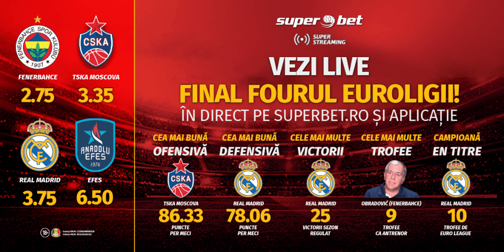 Slam dunk pe net, banii în agenție! Supermeciuri și superpariuri în acest weekend în care baschetul e rege! Semifinalele și finalele Final Four-ului Euroligii se văd și se pariază la Superbet. Realul deține trofeul, dar nimeni n-a reușit să-și apere titlul în ultimele 5 sezoane. Totuși, la ultimele 2 ediții, s-a impus echipa care în Play Off a eliminat-o pe Panathinaikos (Fenerbahce în 2017 și Realul în 2018). Și în acest sezon, Realul a trecut de Panathinaikos în play off (3-0), dar favorita la câștigarea trofeului e Fenerbahce (cota 2.75 la Superbet).