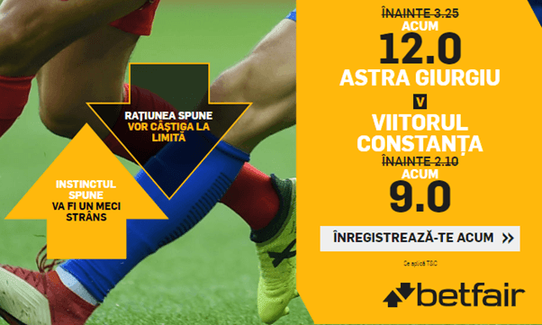 Astra Giurgiu și Viitorul Constanța se întâlnesc în finala Cupei României de la Ploiești, iar Betfair, una din cele mai importante case de pariuri din România, vă oferă două value bet, doar dacă sunteți clienți noi și folosiți acest cod special! Concret, care sunt cotele de pe urma cărora se poate profita?