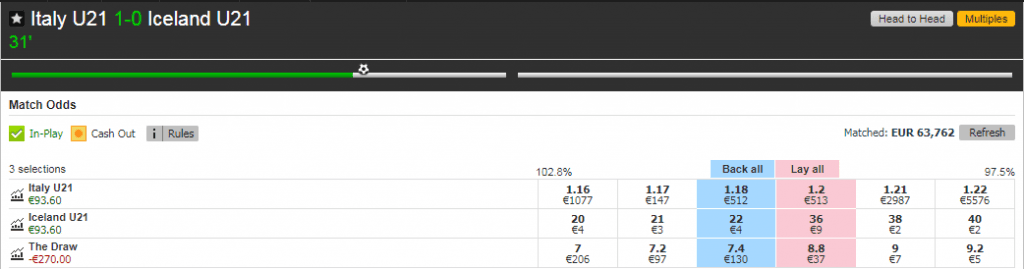 În acest moment avem un profit de 49.20 €, indiferent de rezultatul final. Nu ne interesează dacă Italia U21 este egalată și nici măcar dacă pierde. Noi deja ne-am încasat profitul.