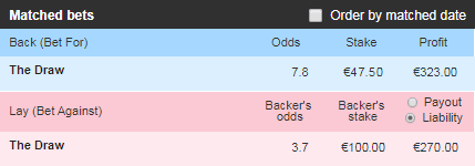 Ar trebui să arate astfel: posibil profit 93.60 € pe victoria gazdelor sau a oaspeților. Risc 270 € pe egal.