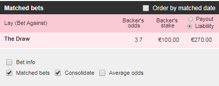 Plasăm un pariu de tip Lay (contra) pe egal la prețul de 3.70. Este același lucru cu plasarea unui pariu șansă dublă 1 sau 2.