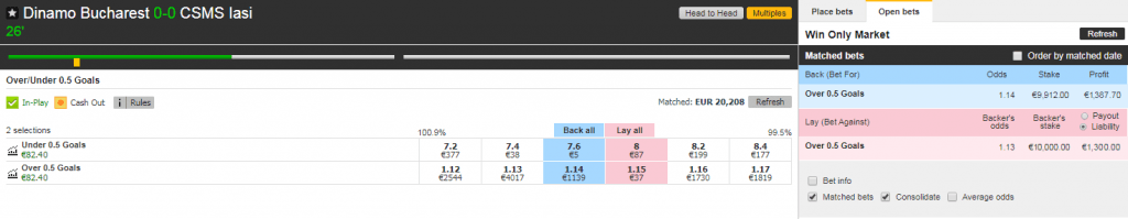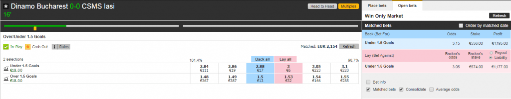 Imediat după ce pariul este plasat, lansăm un pariu pe o cotă mai mare astfel încât să ai profit garantat. Eu am mers pe cota cea mai apropiată. Practic, am cumpărat la prețul de 1.13 și am vândut la 1.14