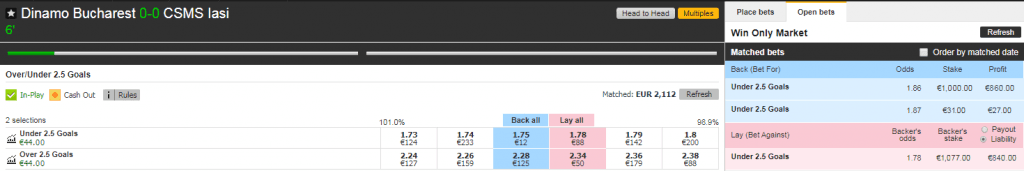 Alegem un meci în desfășurare. Apoi alegem o piață unde cota va fluctua în funcție de timpul scurs din meci. Observăm că jocul este lent așa că intrăm pe piața sub/peste 2.5 goluri. Echipele de abia ce au ieșit de la vestiare și nu par să fi intrat prea energic în meci. Considerăm că nu se va înscrie prea curând. Așa că pariem BACK 1.000 € pe sub 2.5 goluri la cota de 1.86 disponibilă (am prins și puțin din 1.87). Era minutul 3’.