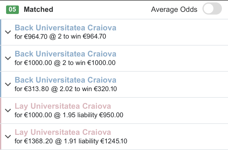 Am speculat această evidentă cădere de cote și am plasat un Pariu BACK pe victoria Craiovei la cotă de 2.02 respectiv 2 și am ieșit din piață la foarte scurt timp plasând un pariu de tip LAY pe victoria Craiovei la 1.95 și 1.91.