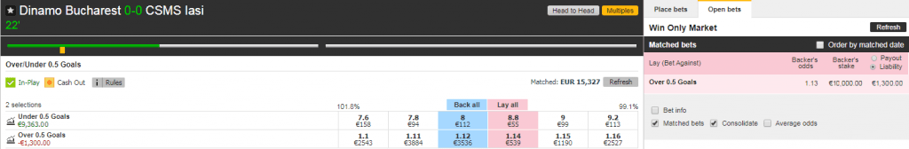 Căutăm bine o cotă foarte mică, dar care este în creștere. Cota de peste 0.5 goluri la început de meci este, de regulă, între 1.01 și 1.15. Odată cu trecerea timpului, aceasta va crește, în cazul în care meciul nu are un ritm prea alert. Plasăm un pariu LAY peste 0.5 goluri @ 1.13 cu miza de 10.000 € (chiar dacă nu îi ai). După cum deja ar trebui să știi, riscul tău este mult mai mic, de doar 1.300 €! De atâția bani avem nevoie în cont.