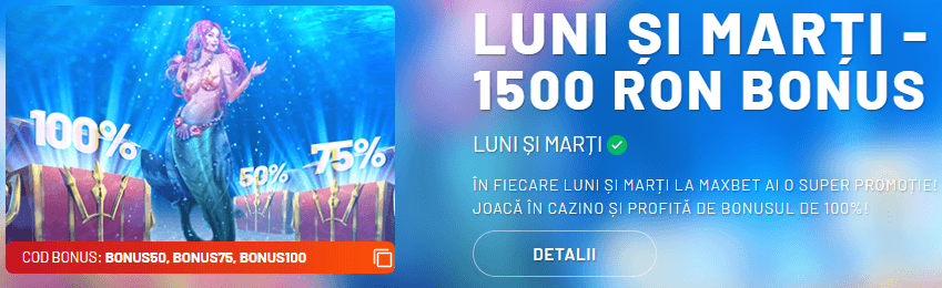 În fiecare luni și marți ai o superpromoție la MAXBET! Joacă în cazino și profită de BONUSUL 100%! Poți beneficia de până la 500 de Lei Bonus pentru fiecare depunere de minim 60 de Lei!