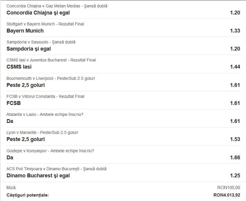 Combinate pe același cupon, meciurile selectate de tipsterii noștri pot oferi un factor multiplicator final tentant, cu posibilități de câștiguri mărite, iar în dreptul fiecărui meci va fi indicat și tipsterul care a propus selecția, astfel, cititorii, putând să tragă o concluzie după anumite intervale de timp!
