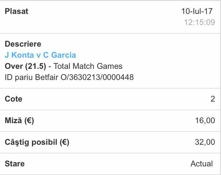 | | | ATP Wimbledon | Berdych vs. Djokovic | peste 3.5 seturi | 1.75 | abandon | VOID |