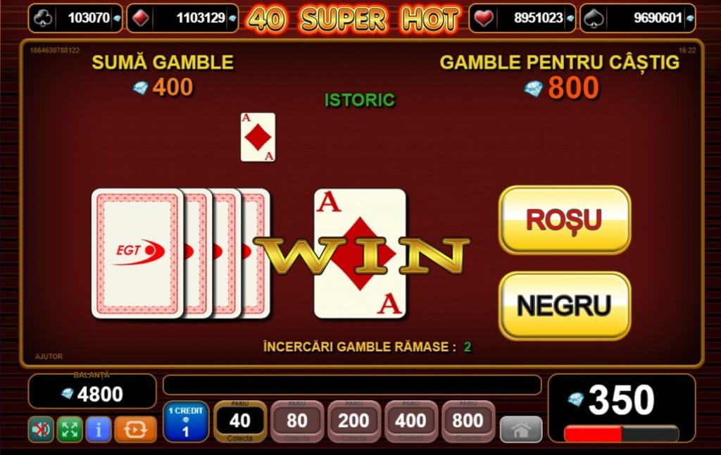 Dublajul te duce la mega câștiguri. După fiecare rundă câștigătoare ai de ales: încasezi sau încerci să ghicești culoarea așilor (roșu sau negru). Ai ghicit, câștigul se dublează. Ai greșit, ai pierdut tot din acea mână. Nu există secvențe corecte când e vorba de dublaje, nu vă mai păcăliți. Cărțile sunt întoarse la întâmplare, de un algoritm al jocului. Nu sunt pre-stabilite, nu sunt setate să te oprească la un anumit câștig. E mult, mult mai simplu: ai noroc, câștigi. Nu ai, pierzi. Sfatul meu e să nu încerci să dublezi orice mână, pentru că e posibil să pierzi tot. Dacă ai un câștig bun fără dublaj, încasează-l sau dublează-l o singură dată. Eu încerc să dublez doar la cireșe, portocale sau lămâi, unde câștigul e mic (cel mult de 2 ori miza). Când încerc să dublez orice câștig ajung să închid slotul fără vreun ban în plus.