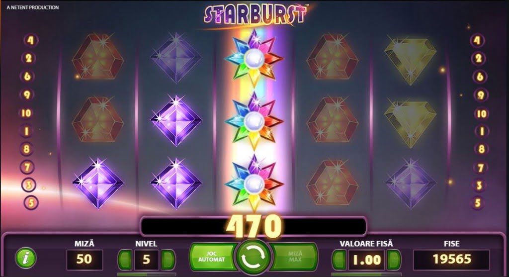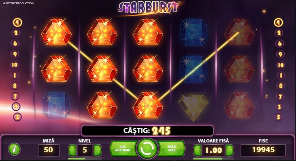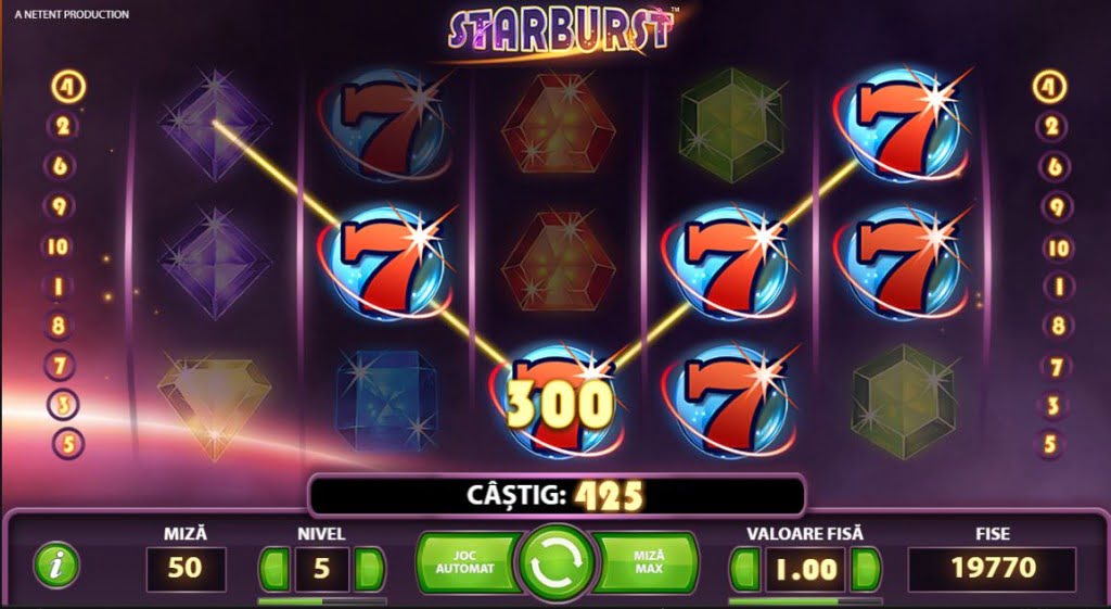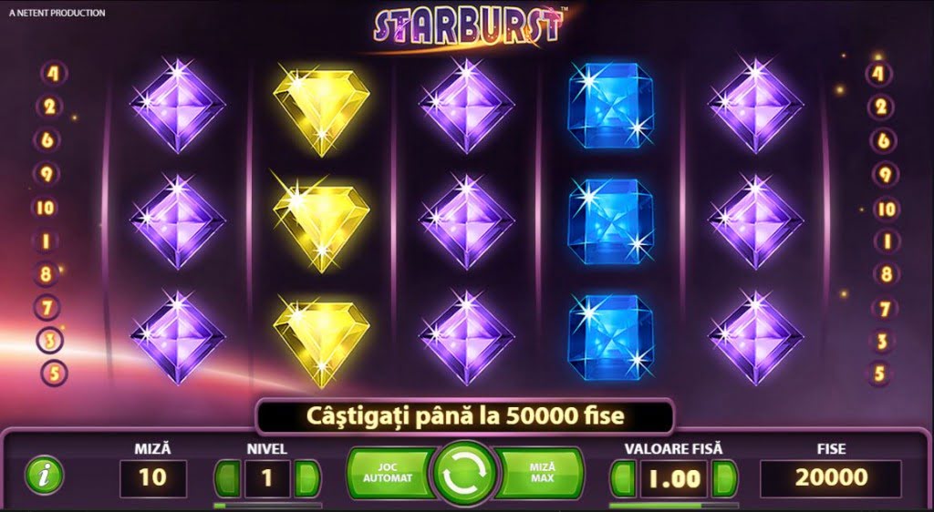 Starburst nu are un succes uriaș în România, deși este disponibil la foarte multe cazinouri online. În schimb, în Europa occidentală, Starburst este punctul principal de atracție când e vorba de sloturi online. Un clasic al jocurilor ca la aparate online, plin de diamante strălucitoare și grafică modernă, fix pe gustul Păcănicii.
