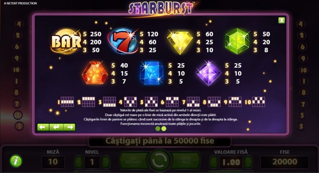 La Starburst câștigi des, mulțumită liniilor de plată valabile din ambele direcții. Când ai trei simboluri identice, indiferent de partea din care pornesc, vin și banii. Simbolul BAR e cel mai important, aducând de 250 de ori miza.