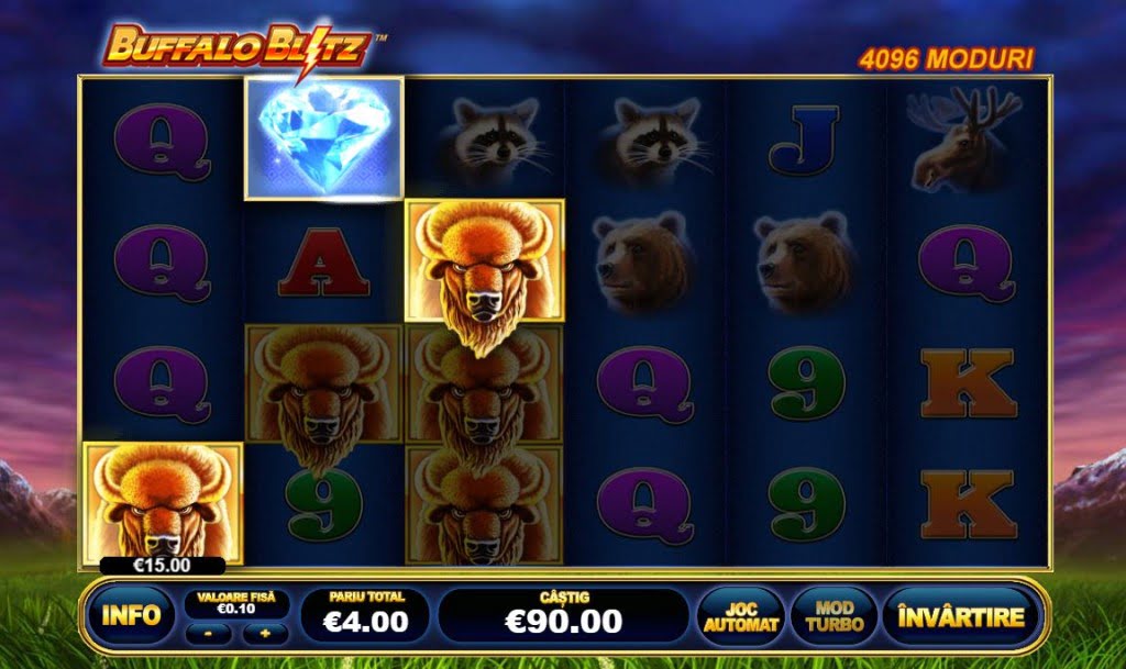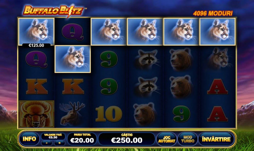 PlayTech a dat lovitura cu Buffalo Blitz, un joc ca la aparate care dă câștiguri destul de des. Sunt 4.096 linii de plată, fără să țină cont de diagonalele obișnuite. Asta pentru că jocul are formatul „All Ways”: e suficient ca simbolurile să înceapă de la prima coloană și să fie pe coloane alăturate pentru câștiguri. În funcție de valoarea simbolurilor, poți câștiga chiar și cu 2!