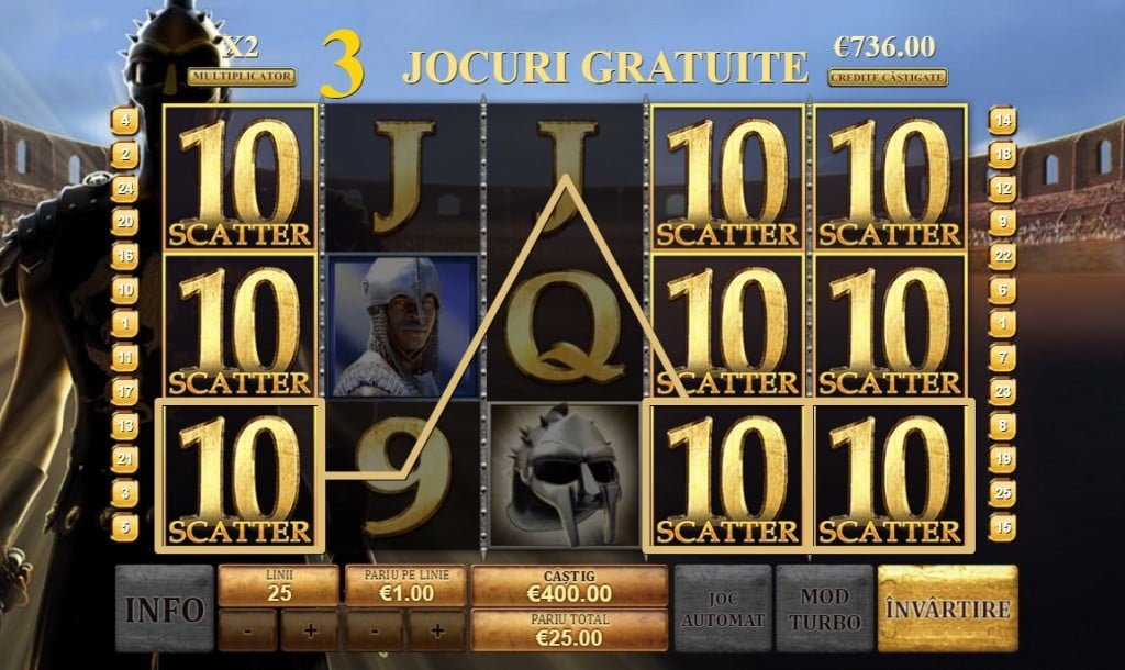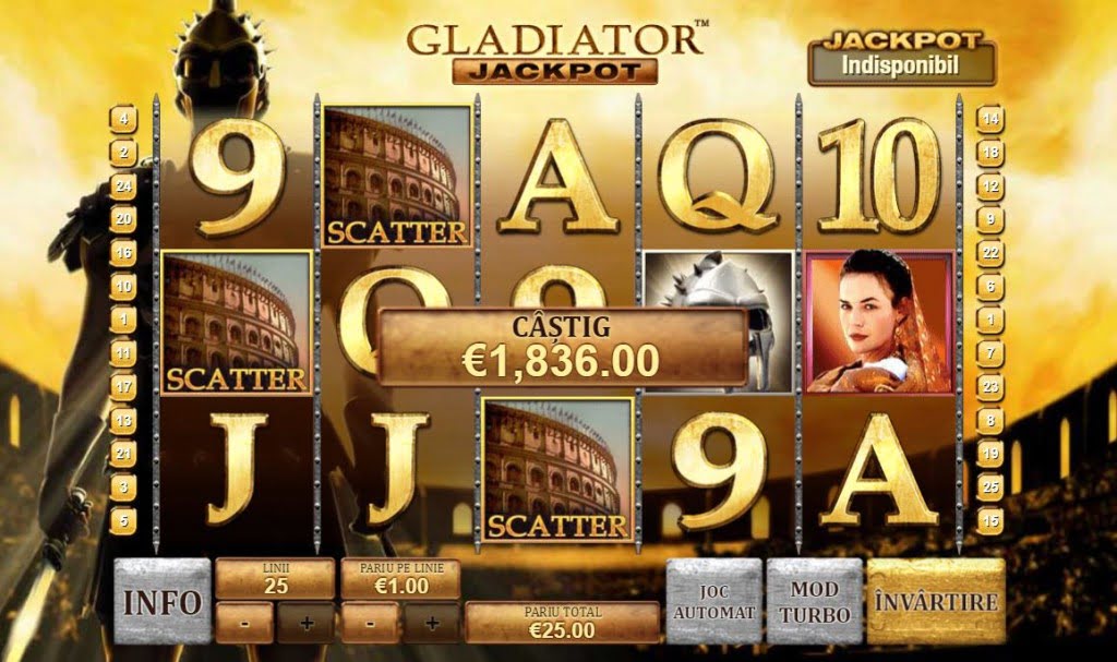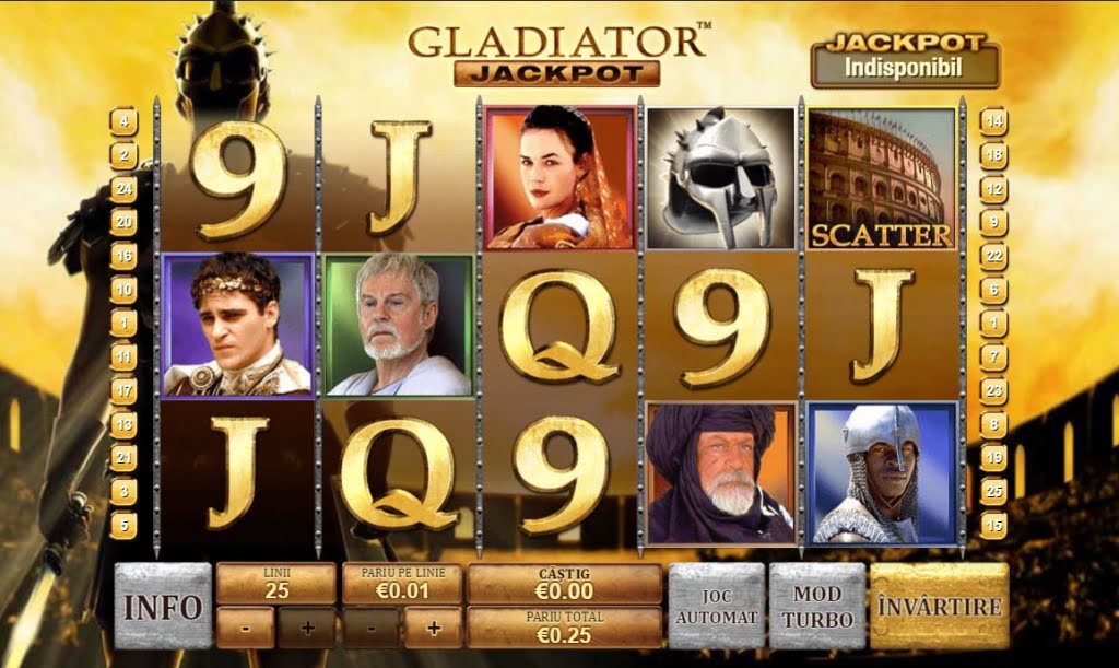 Gladiator e un joc ca la aparate creat de PlayTech. Are 25 de linii de plată cu bonusuri în joc, runde gratuite și, cel mai important, un Jackpot! Poți să scazi numărul de linii de plată, chiar până la 1 (unde pariezi doar pe linia rândului din mijloc), dar nu recomand. Sunt destule păcănele cu puține linii de plată pe care le poți juca.