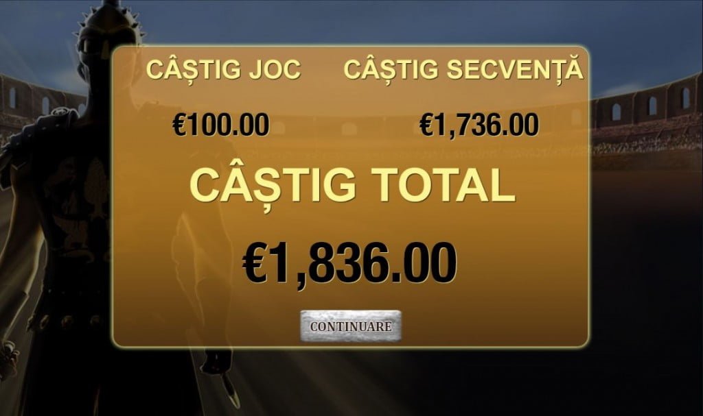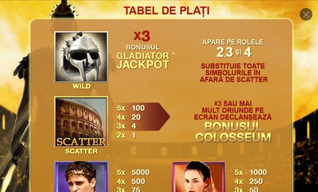 Jackpot-ul îl poți câștiga doar în modul Bonus Gladiator Jackpot, care se declanșează dacă apar trei gladiatori pe coloanele din mijloc. În acest mod de joc apar pe ecran diferite coifuri – din bronz, argint și aur. Când ai 9 coifuri de aur pe ecran, vine și jackpot-ul, care poate ajunge la sume colosale!