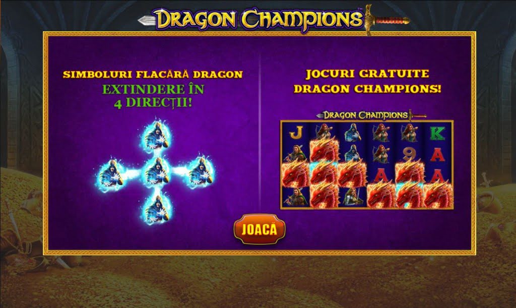Specialele sunt scuturile Free Games, care îți pot da 100 de runde gratuite, și focul Dragon Champions, cu rol de Wild – deci înlocuiește orice simbol.