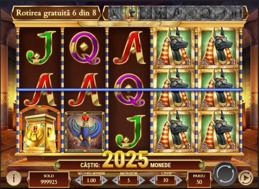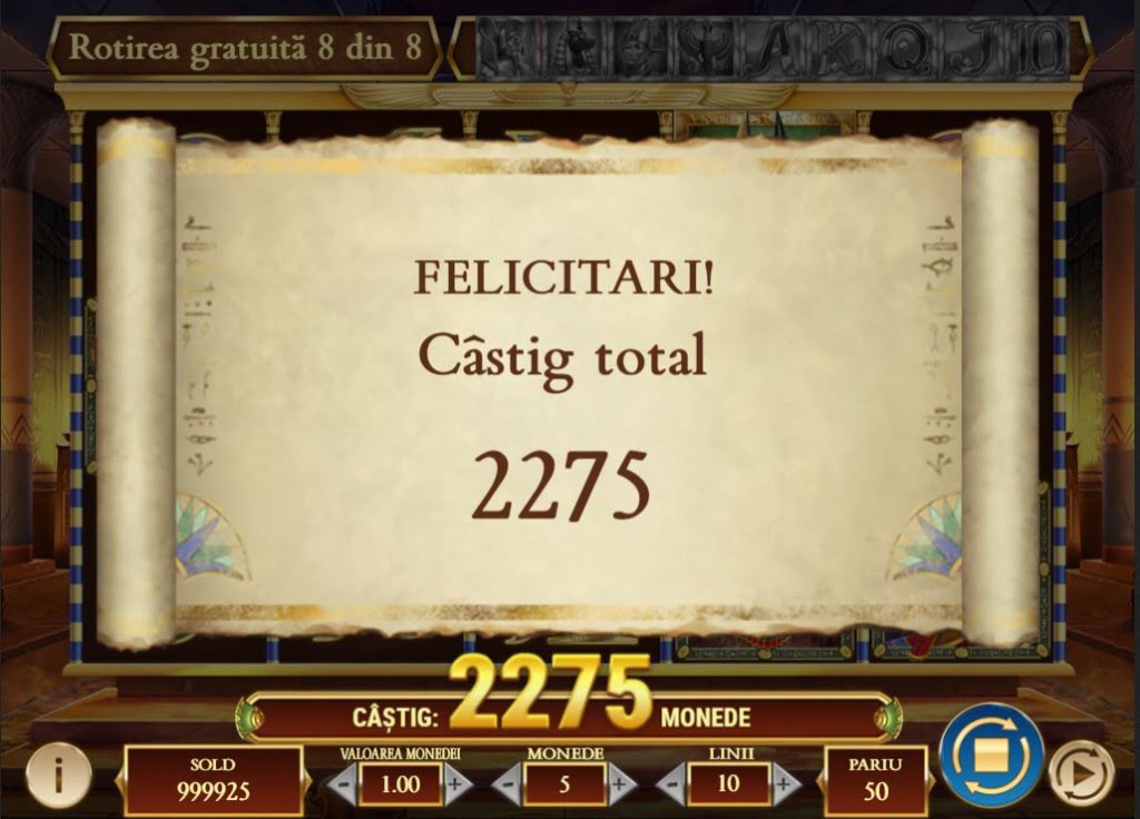 Simbolul special este mormântul faraonului, care îți înmulțeste de 5 ori miza dacă apare de 5 ori, declanșează 8 runde gratuite dacă apare de 3 ori și, în rest, poate înlocui orice simbol. E Wild, e Scatter și e simbolul cu cea mai mare plată.