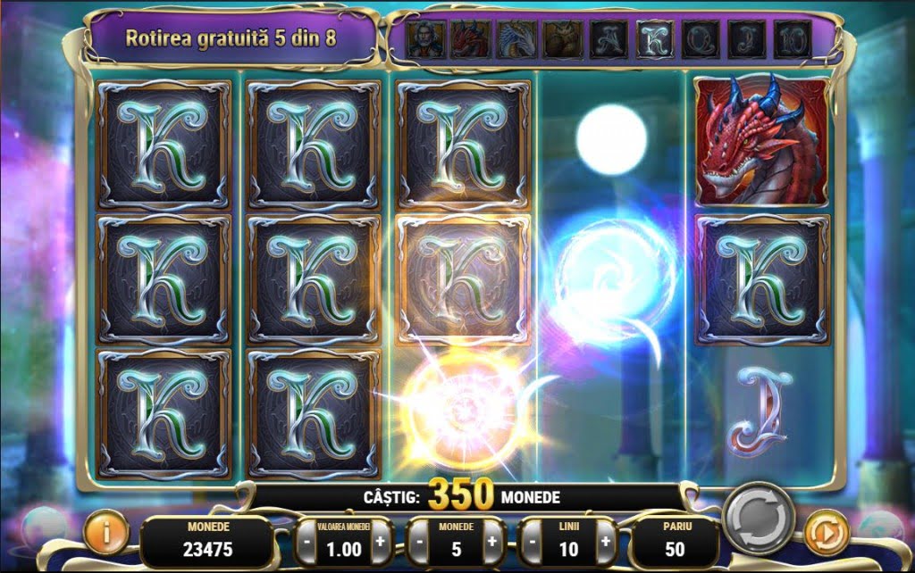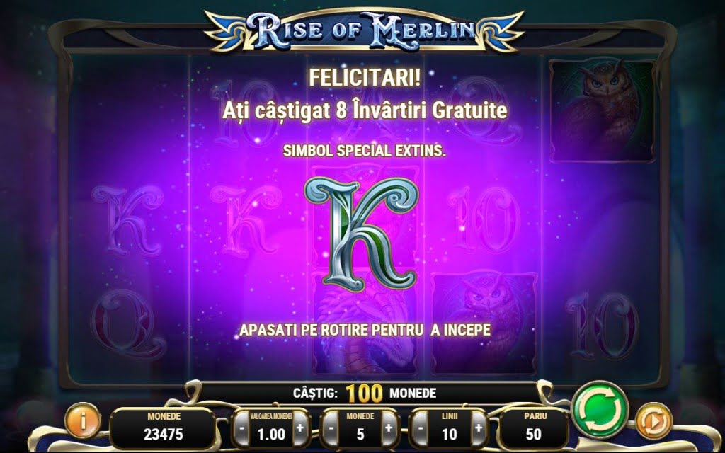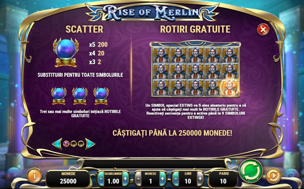 Dacă îți plac sloturile video Play’n Go, sigur știi Rise of Merlin. Dacă nu, Păcănica te asigură că merită încercat. Ca format, e în aceeași notă cu jocurile mega-cunoscute de la ei. 10 linii de plată, 5 coloane, Scatter-Wild care duce la runde gratuite, simboluri expandabile. Și o grafică foarte, foarte bună, ca la toate sloturile Play’n Go.