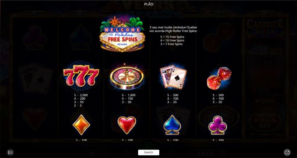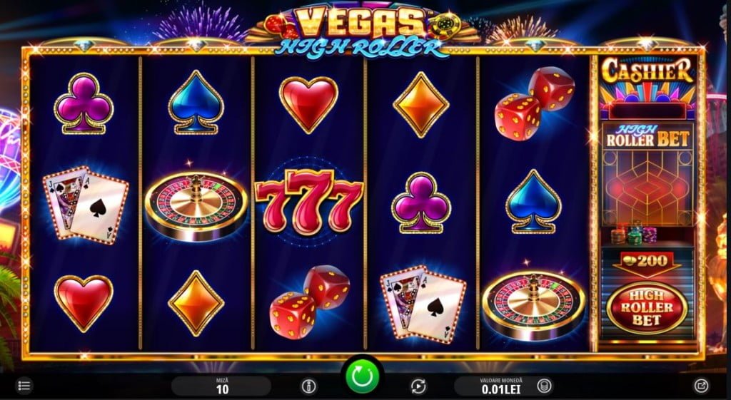 Am încadrat jocul în categoria Vegas, și acum să vă spun și care sunt simbolurile: șeptarii, ruleta, cărți de joc de Blackjack (J și A pe un simbol), zarurile și cele 4 tipuri de cărți – inimă roșie, inimă neagră, caro și treflă. Șeptarii plătesc cel mai bine: 5 șeptari înseamnă miza de 2.000 de ori! În dreapta jocului, arată ca o a șasea coloană, ai logourile de Cashier, High Roller Bet și butonul prin care poți intra în High Roller Bet. Le explic mai jos, la „Cum câștigi”.