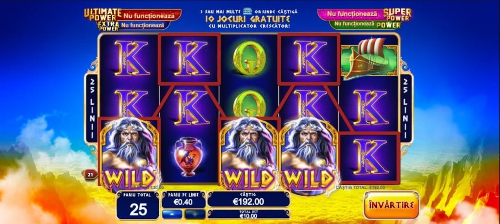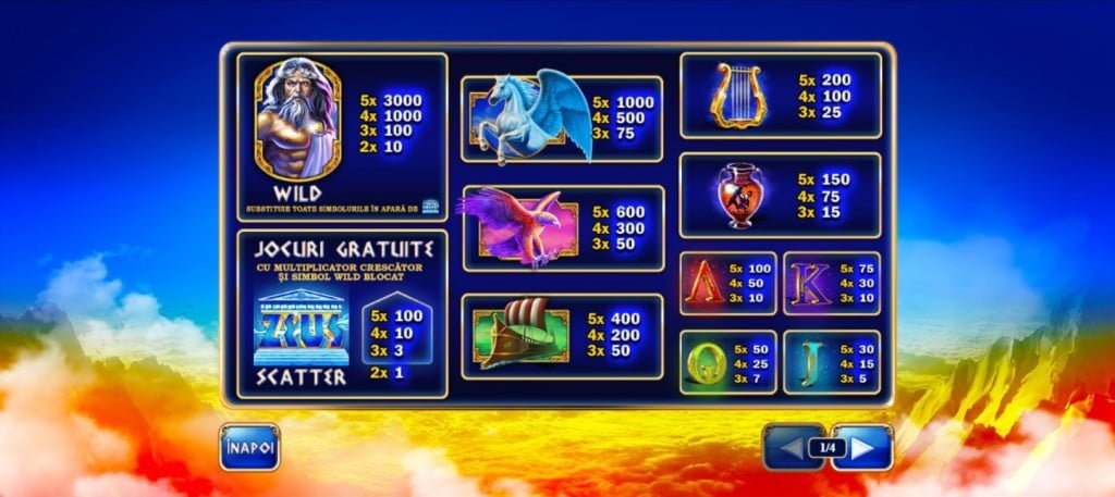 Zeus e cel mai tare: de 5 ori pe linie înseamnă miza de 3.000 de ori! Pegasus, vulturul, corabia, harpa și vaza sunt celelalte simboluri tematice, iar restul sunt cărți de joc ( J – A ).