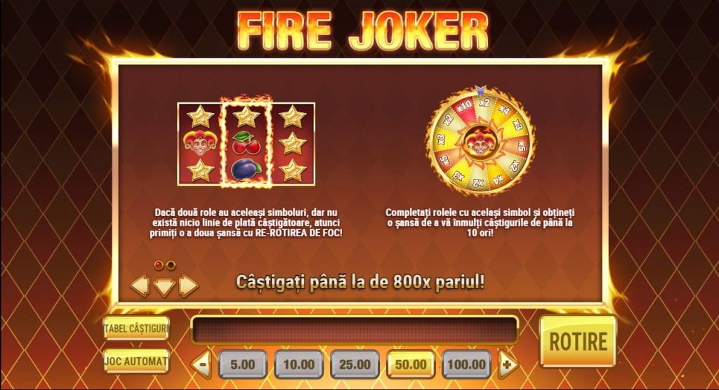 Play’n Go e un furnizor care oferă sloturi video din toate categoriile. Unele sunt ultra-moderne și cu multe opțiuni de bonusuri, altele sunt cu design excelent și dublaje, iar altele sunt foarte, foarte simpliste. Așa e Fire Joker. 3 linii și 3 coloane, 5 linii de plată, 9 simboluri, câștig doar dacă un simbol apare pe fiecare coloană. E genul de joc la care parcă te întrebi dacă nu cumva e o greșeală și e făcut de EGT. Îți dai seama că nu e atunci când te convingi că nu ai dublaje, dar ai un bonus care compensează.