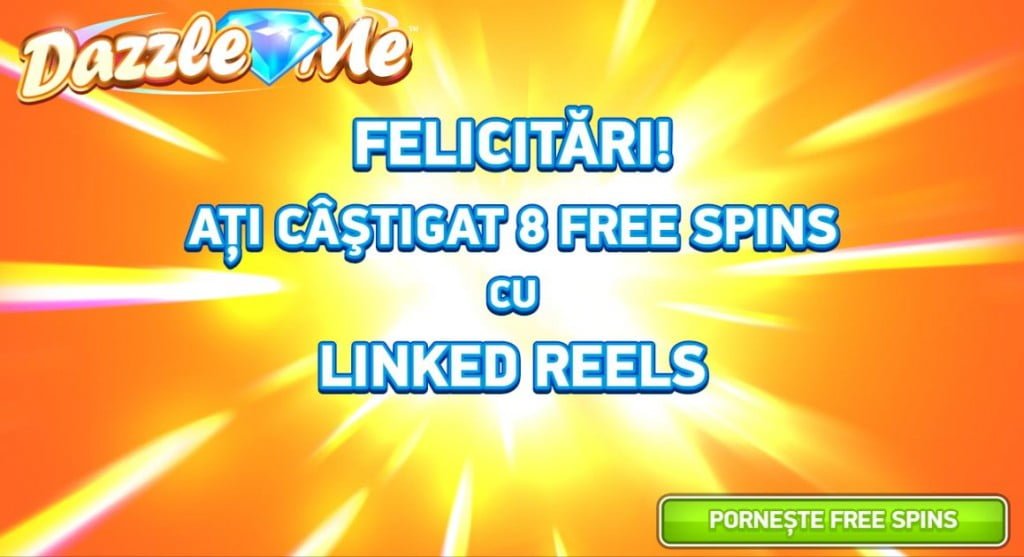 Al doilea vine la rotirile gratuite. Simbolul de Free Spins e și scatter, deci nu contează unde apare pe ecran pentru a le declanșa. 3 simboluri îți dau 8 runde gratuite; 4 simboluri înseamnă 12 și 5 Free Spins-uri înseamnă 16 runde gratuite. La nivelul cu care câștigi la Dazzle Me, e imposibil să nu încasezi mult în timpul lor. Vin destul de greu rundele gratis, ăsta e singurul lucru enervant la Dazzle Me.