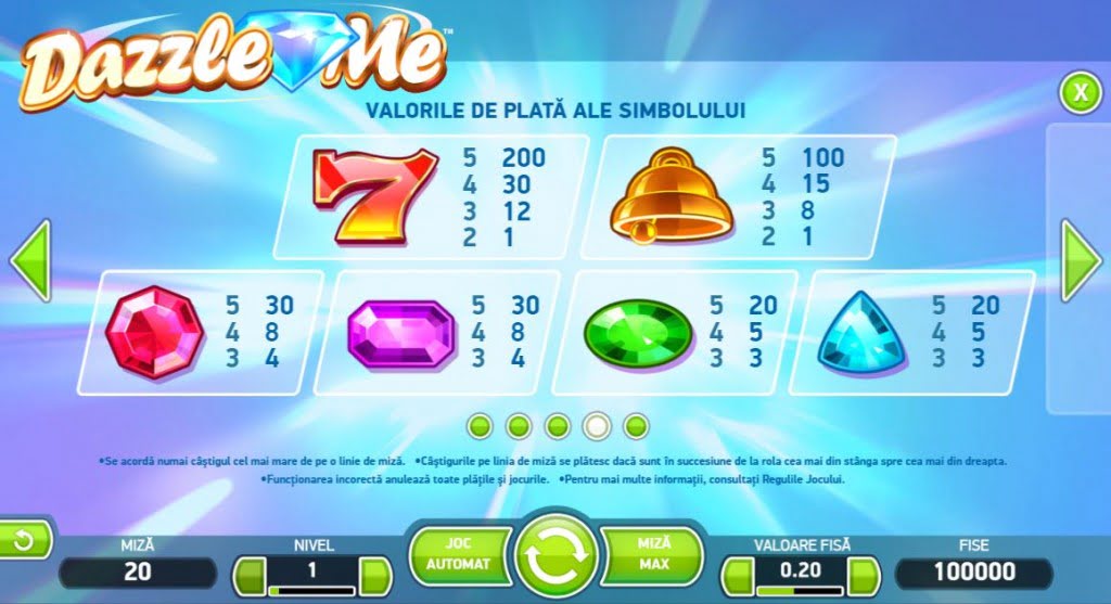 Șaptele e cel mai valoros aici și îți dă miza de 200 de ori când apare pe toată linia de plată. Dazzle Me mai are clopoței și 4 simboluri de pietre prețioase.