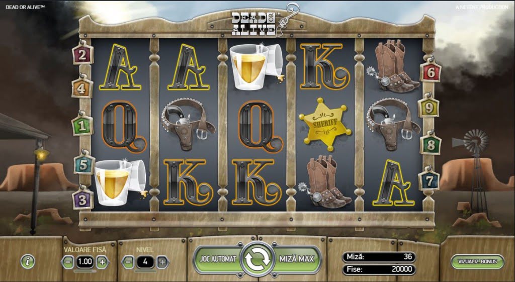 Dead or Alive are un background întunecat, ducându-te din prima în atmosfera jocului. Apoi vezi simbolurile, care-s din aceeași zonă. Iar când rotești, auzi sunetul biciului pe cai sau pe cel al împușcăturilor dintre cowboy. Asta e doar distracția inițială, pentru că apoi ai multe posibiltăți de câștig, rotiri gratuite, wild-uri dese și alte bonusuri caracteristice NetEnt!