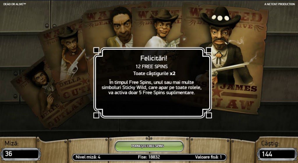 În timpul rotirilor gratuite se activează bonusul Sticky Wild. După ce apare un Wild, rămâne pe aceeași poziție pe toată perioada rundelor gratis, așa că ai aproape la fiecare rotire un câștig după primul Wild. Spre finalul rundelor gratuite, când deja ai câteva Wild-uri pe ecran, câștigurile devin deja uriașe. În momentul în care ai 5 afișe de „Wanted Dead or Alive” pe aceeași linie primești 5 rotiri suplimentare, pe lângă profitul de 1.500 x miza dat de linie.
