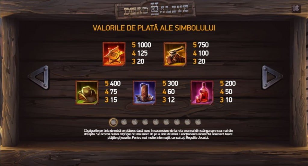 E exact ca la originalul Dead or Alive: cu simbolurile principale din joc, în special steaua șerifului. Jocul are tot 9 linii de plată, așa că aici vei avea câștiguri ceva mai mari în modul obișnuit de joc decât la alte sloturi de la același furnizor, dar mai rare din cauza numărului mare de simboluri (10). Diferența se face la bonusuri și față de alte păcănele NetEnt, dar și față de predecesorul jocului.