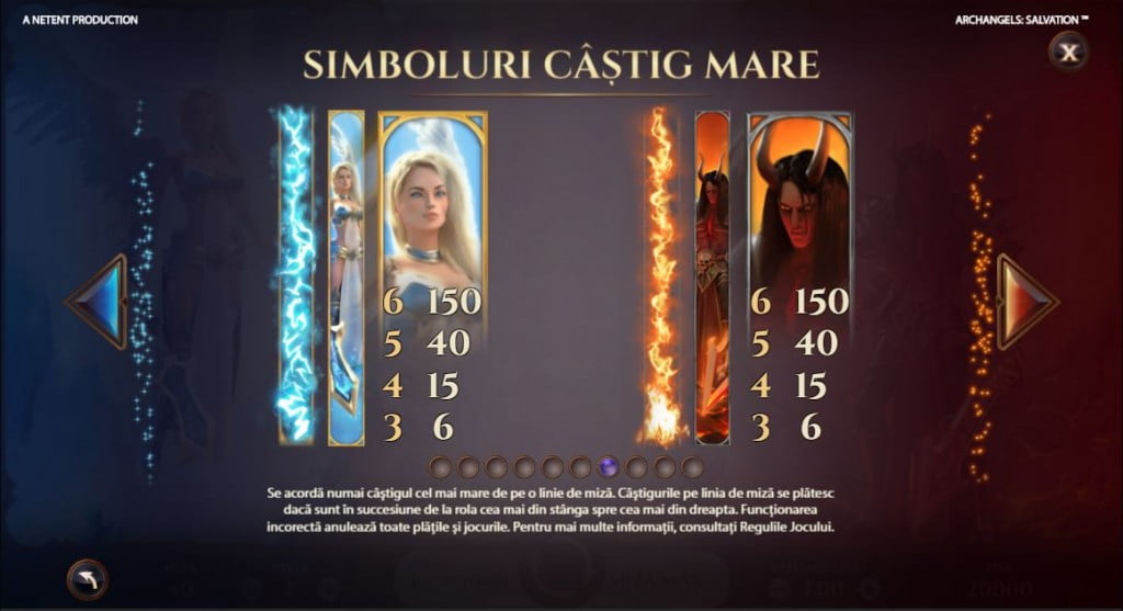 Cu simbolurile principale ale jocului – îngerul și demonul – dar ești ajutat de Wild și de tendința simbolurilor de a veni stivuite. Sunt 100 de linii de plată, deci multe șanse de câștig.