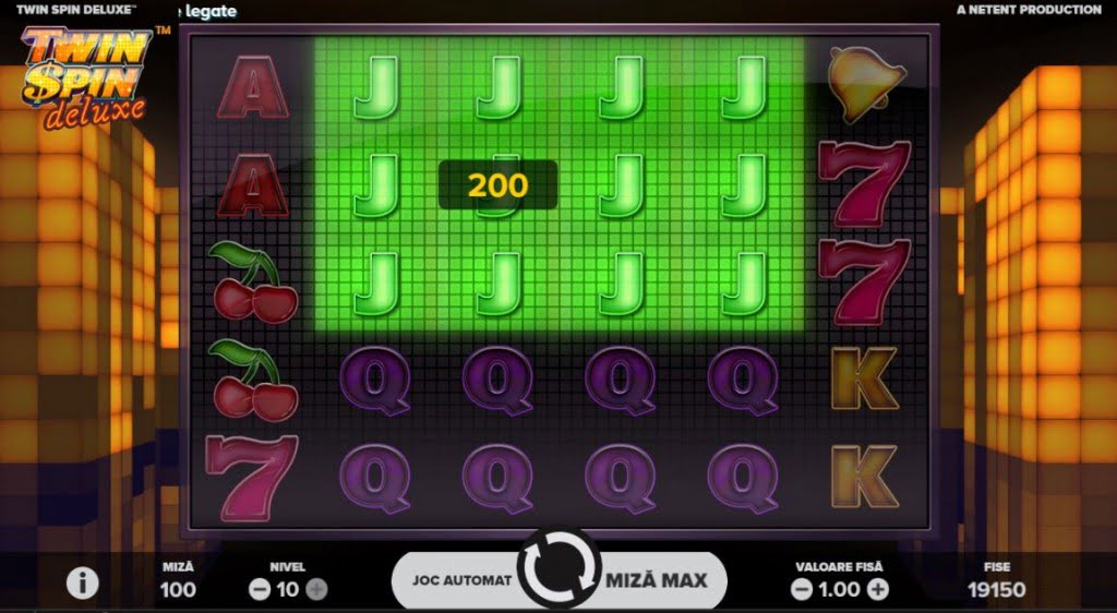 Twin Spin Deluxe e un joc de aparate rar, care nu folosește linii de plată, ci formula Cluster Pays. Practic, plătește în funcție de cât de des apare un simbol pe ecran, nu de locurile în care se află. Mii de posibilități de câștig aici.