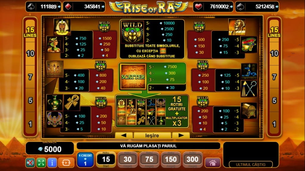 La Rise of Ra îmi place că ai, față de alte sloturi ale furnizorului, modul de joc bonus cu cele 15 rotiri gratuite. Apreciez și că tematica egipteană a fost folosită bine, cu imaginea de fundal a jocului și cu toate simbolurile din mitologia sau istoria lor.