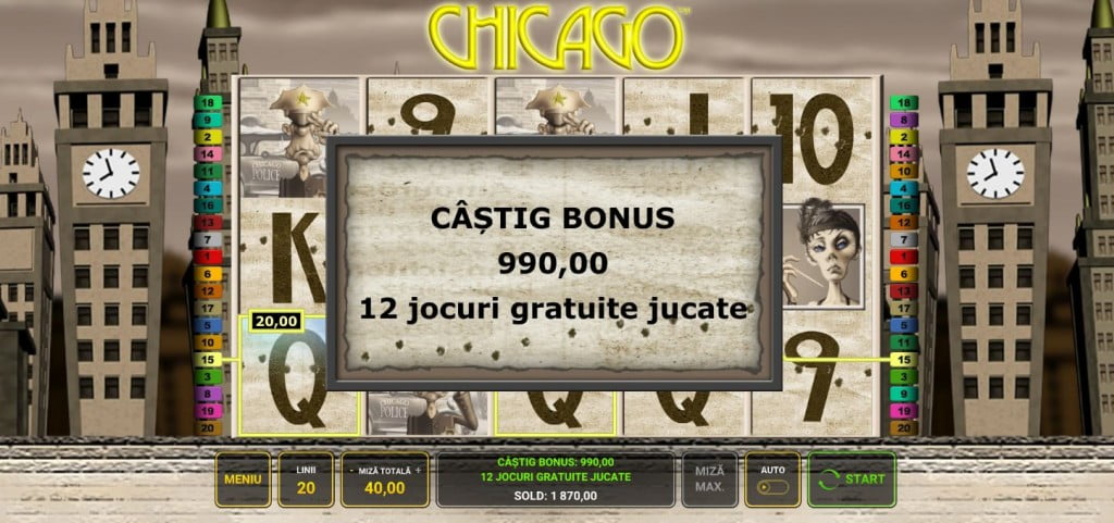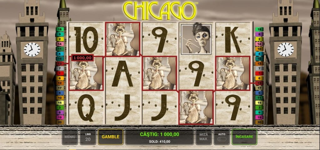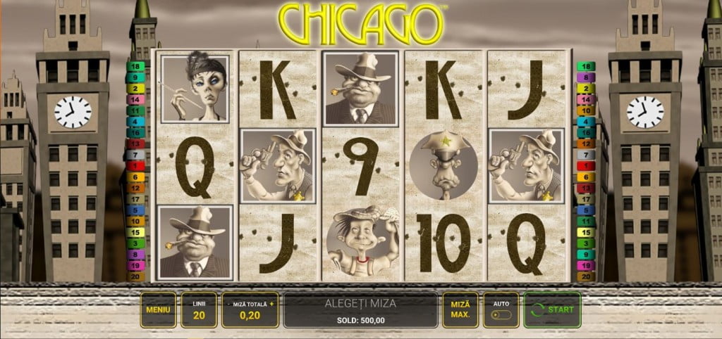 Chicago e printre cele mai bune sloturi făcute de Novomatic. Mi-a atras atenția din prima secundă prin grafica foarte, foarte cool. Jocul e desenat și e aproape tot alb-negru; cu o atmosferă din orașul american din epoca de aur a mafiei. Simbolurile sunt tot în acea nuanță, cu Al Capone și alte personaje caricaturizate. Jocul e atât de tare că mă face să-mi pară rău că nu avea și Cartoon Network desene de astea.