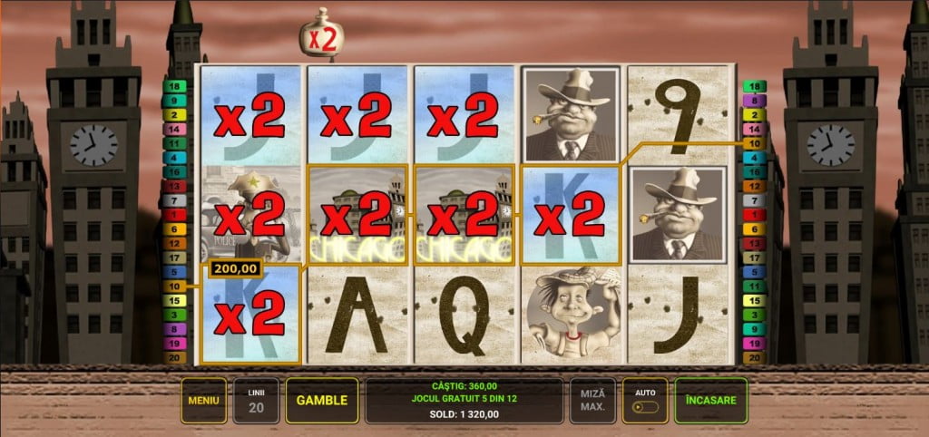 Al Capone și un polițist – aici nu bag mâna în foc că e caricatura lui Eliot Ness, cel care l-a prins – sunt simbolurile cu cele mai bune plăți: miza de 100 de ori. Mai avem o femeie, un polițist și un copil, desenați în același stil; iar restul ecranului e completat de cărți de joc de la 9 la A.