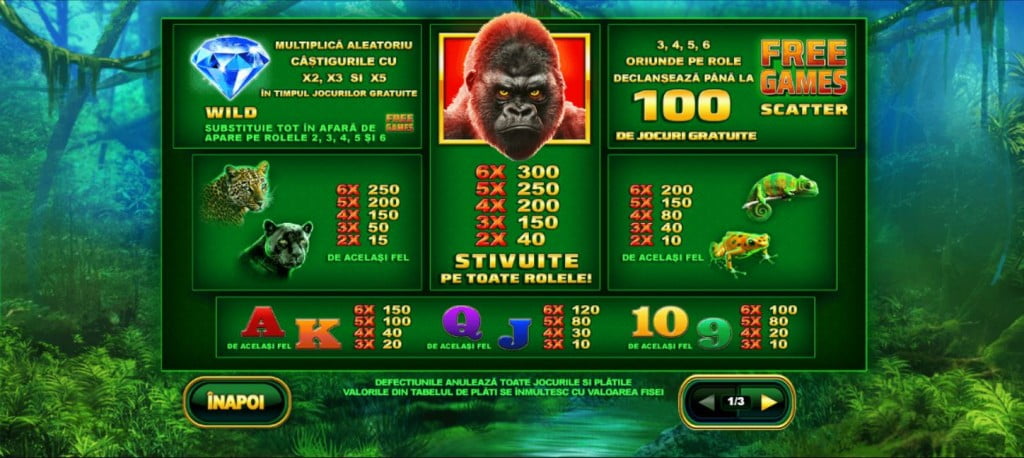 Animalele sunt cele mai importante din joc. Gorila îți aduce miza de 300 de ori când apare pe toate coloanele, iar celelalte simboluri tematice sunt jaguarii, panterele, cameleonii și broaștele. Ca la majoritatea sloturilor PlayTech, restul sunt cărți de joc ( 9 – A ).