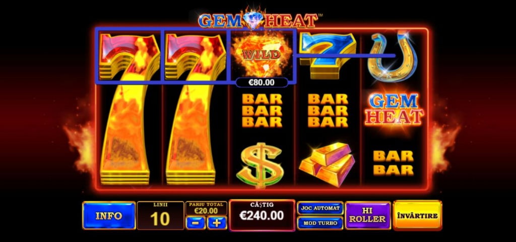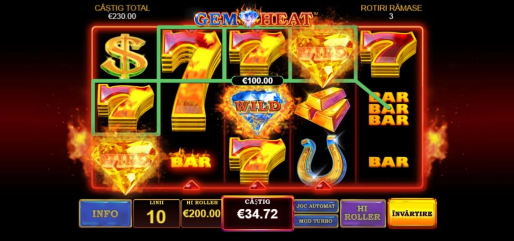 Șeptarii apar stivuiți și pot ocupa toată coloana, așa că ai șanse să acopere mai multe linii. Iar diamantul apare destul de des. La Gem Heat sunt câștiguri mai mari decât la alte sloturi PlayTech care au mai multe linii de plată, dar te îmbogățești doar atunci când iei rotirile gratuite.