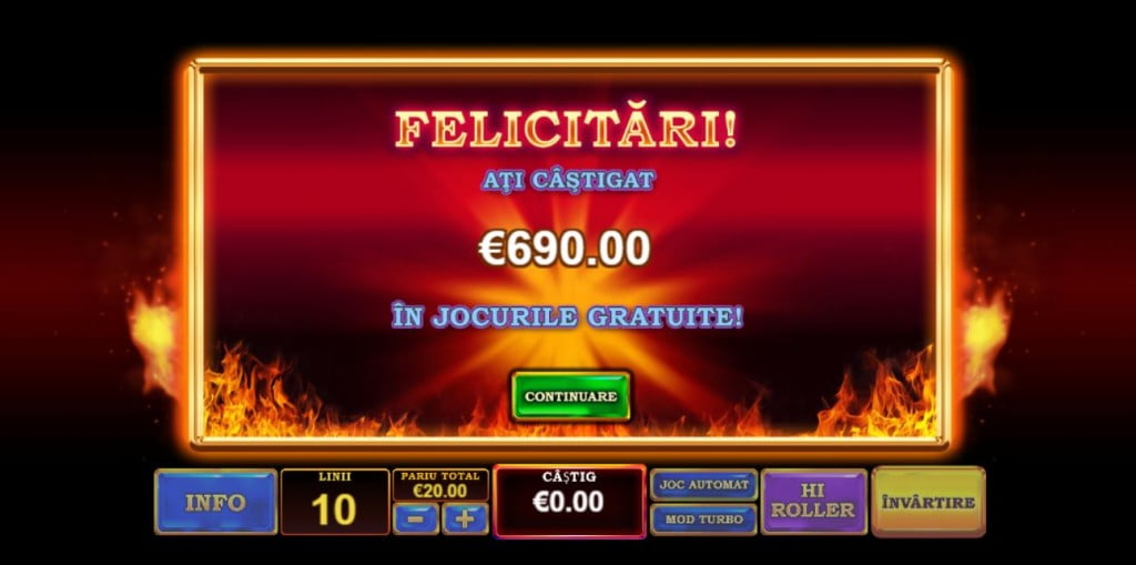 Un alt lucru important al jocului e funcția Hi Roller, pe care o poți activa timp de 5 runde din butonul de lângă rotire. Miza crește foarte mult – ai de ales dacă de 10 sau de 20 de ori, iar pe role se învârte doar Wild-ul. În modul Hi Roller cu miza x 10 ai Wild doar pe coloana 3, iar în cel cu miza x 20 ai Wild pe toate coloanele din mijloc. Și aici, Wild-ul dă upgrade șeptarilor. Atenție: miza este pentru toate cele 5 rotiri. Deci, la o miză de 10 lei pe rotire, dacă alegi Hi Roller x10, toate cele 5 rotiri te vor costa 100 de lei. Eu le-am tot jucat și nu pot să zic că am scos ceva profit în Hi Roller. De obicei câștigul e cam cât miza la finalul modului.