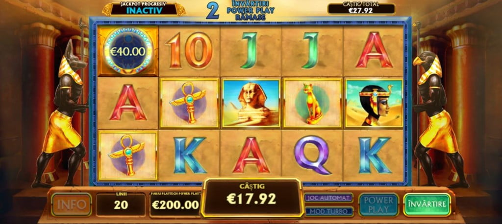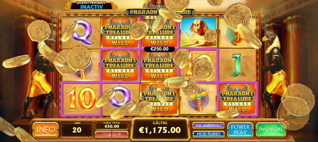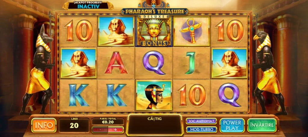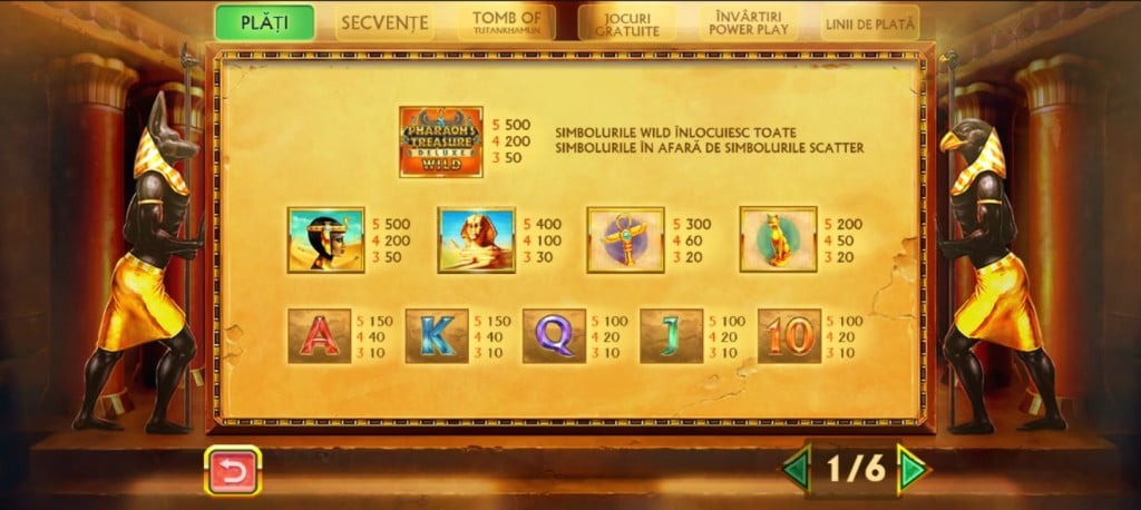 Nu în ultimul rând, Pharaoh’s Treasure Deluxe are opțiunea de high-roller, numită Power Play. Aici, simbolul special cu logoul jocului se poate transforma, la întâmplare, în Wild, Multiplicator sau bani cash. Tu va trebui să alegi când activezi modul Power Play dacă vrei miza x10 sau x20. Practic, dacă miza ta este de 1 leu pe rotire, aici vei miza în total 10 sau 20 de lei (în funcție de ce alegi) pe parcursul a 5 rotiri. Modul x10 îți aduce simbolurile bonus doar pe prima coloană; cel x20 le aduce pe primele 3 coloane, cu șanse mai mari și mai multe de câștig.