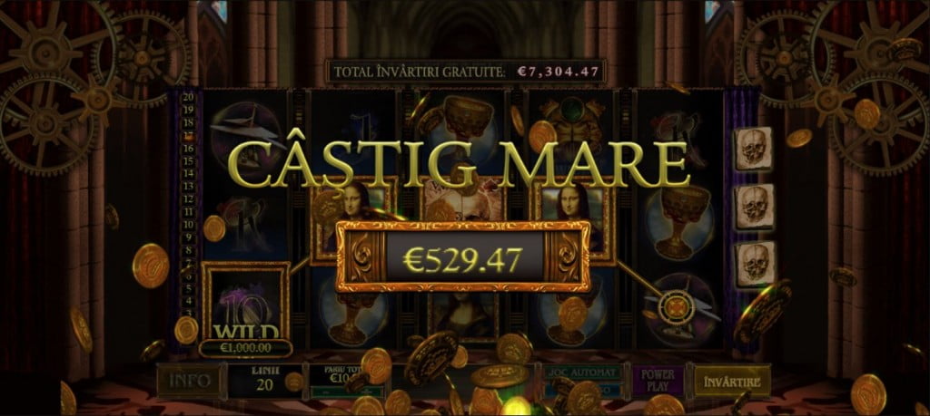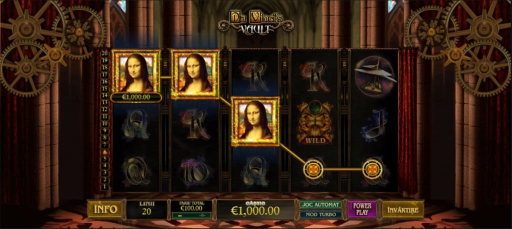 Power Play e funcția de high-roller, unde plătești de 10 ori mai mult pentru 5 rotiri. Practic, dacă ai miza de 10 lei pe rotire, vei plăti 100 lei pentru cele 5 rotiri. În timpul acestor runde apar sigilii (de bronz, argint sau aur) pe simboluri și tu le aduni deasupra ecranului. Când ai suficiente sigilii de același fel, ești dus în seiful lui Da Vinci – în funcție de sigiliile adunate. Eu am ajuns de fiecare dată în seif; iar de cele mai multe ori în cel de aur. Seiful lui Da Vinci e o roată a norocului unde poți câștiga fie o sumă de bani (mare), fie rotiri gratuite.