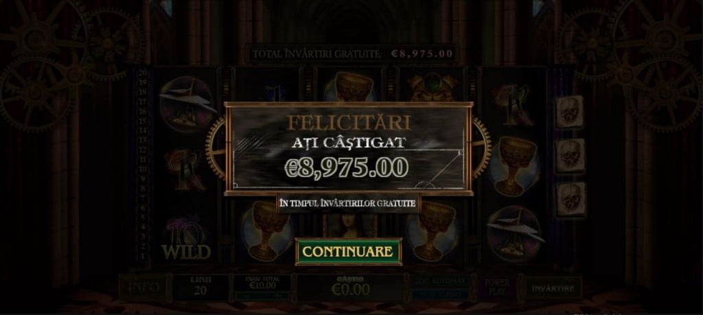 Rotirile Gratuite pot ține minute bune, pot fi sute de rotiri! Nu există un număr maxim. Rotești și câștigi. Când apare un craniu pe ecran, transformă un simbol în Wild (care rămâne Wild pe toată durata rundelor gratis). Al doilea craniu face același lucru cu un al doilea simbol; deci ajungi la runde gratis cu 3 Wild-uri diferite. Îți dai seama ce bani se strâng? Al treilea craniu care apare oprește, însă, rotirile gratuite. Dar durează mult până să apară. De fiecare dată apuci să rotești măcar de câteva zeci de ori.