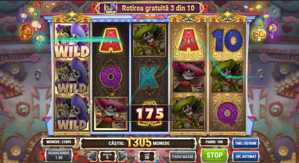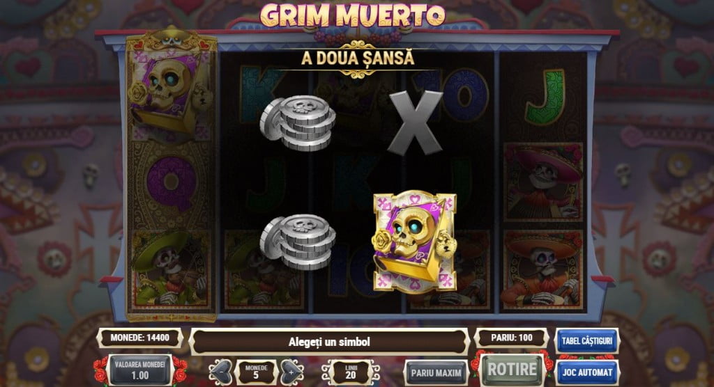 Poți primi rotiri gratuite și cu două Scatter-uri prin funcția A doua șansă. Dacă ai doar 2 Scatter-uri pe ecran intri într-un mod separat de joc, cu 4 mariachi pe ecran. Doi dintre ei ascund bani, unul ascunde un Scatter iar unul n-are nimic. Tu alegi unul dintre ei și primești ce ascundea el – dacă îl iei pe cel cu Scatter-ul ai, automat, rotirile gratuite.