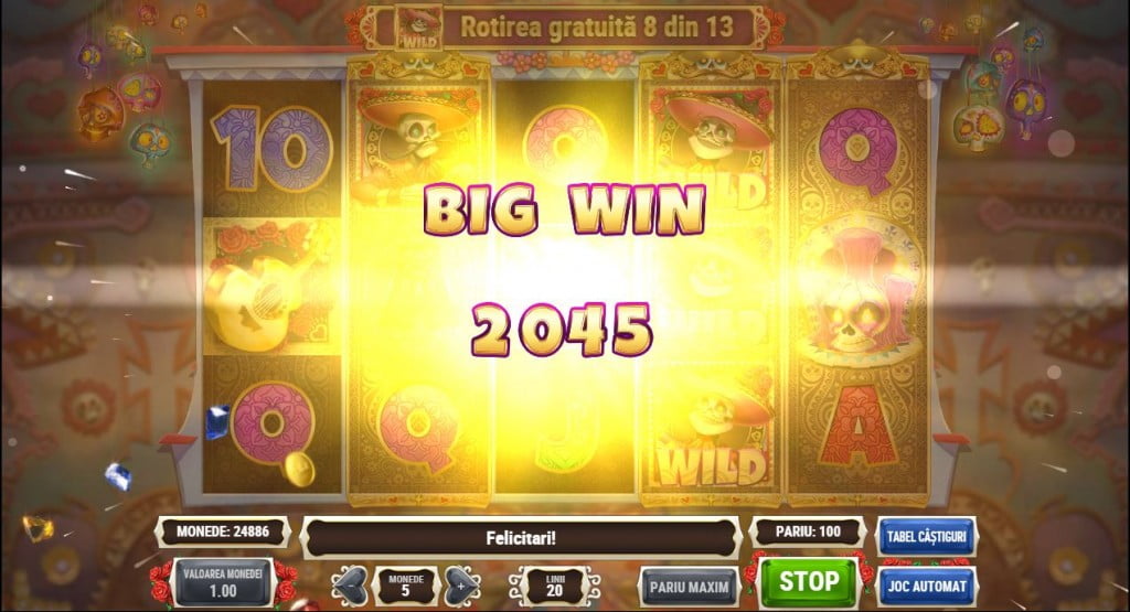 Cu mariachi, dar câștigurile sunt dezamăgitor de mici. Pe cât de mult îmi place ideea și grafica jocului, pe atât de dezamăgită am fost de câștiguri. Încasezi cam la o rundă din două, dar aproape de fiecare dată e un câștig mai mic decât miza. E rar să spun la un joc că mi-aș dori să am dublaje, dar ăsta e un exemplu. Dacă tot sunt câștiguri mici, măcar să le putem mări noi, altfel de ce mai jucam la păcănele?