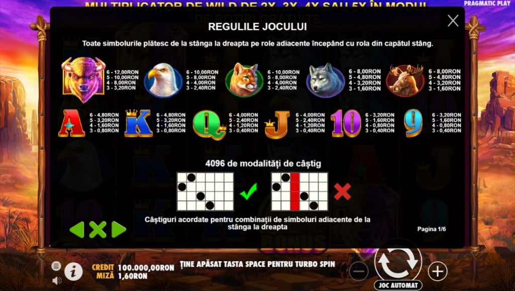 Nici nu știu ce să zic la slotul ăsta. Ar trebui să dau copy/paste la Buffalo Blitz de la PlayTech. Dar atunci aș face exact ce a făcut Pragmatic, aș copia în totalitate. Pe bune, jocul ăsta e o copie fidelă. Aceeași temă, aceeași grafică, până și simbolurile sunt aceleași. Și liniile de plată, tot pe All Ways se merge, cu 4096 linii și ecran de 6×4. Care e rostul lui, că nu înțeleg? Bun, sunt de acord că e plin de păcănele copiate. După Book of Ra au apărut vreo 10 jocuri de aparate „Book of ..” cu tematică egipteană. Jocuri cu fructe sunt mii. De aparatele cu zeii Greciei Antice nu mai vorbesc. Dar n-am avut niciodată, până la Buffalo King, senzația că joc fix același slot.