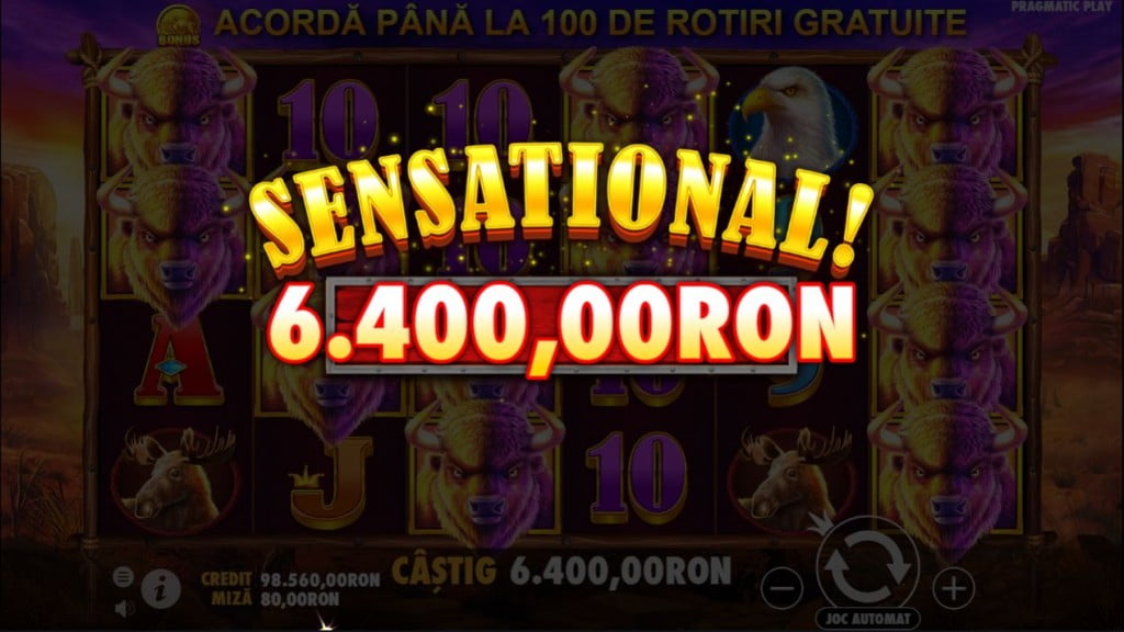 Câștiguri mari poți avea când prinzi mai mulți bizoni pe primele coloane sau la rotirile gratuite. Cu 3 Scatter-uri iei 8 rotiri (maximul fiind de 100, la 6 Scatter-uri); iar ele pot fi prelungite în rundele bonus chiar și cu 2 Scatter-uri. Un alt avantaj în timpul bonusului e că Wild-ul devine și multiplicator, între x2 și x5. Deci poți avea niște câștiguri uriașe dacă prinzi un Wild cu multiplicator x5 lângă animale. Dar rămâne aceeași problemă ca la jocul obișnuit: câștigurile sunt prea rare. Probabil mai sunt, dar mie nu-mi vine în minte niciun joc unde să am un câștig la 10 rotiri gratuite.