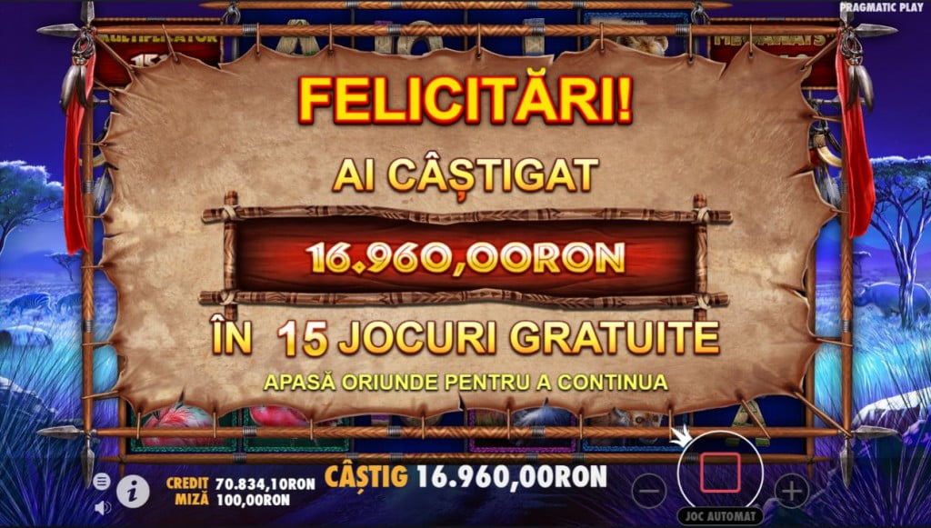Mai sunt două lucruri la joc: Mod Miza Specială (în stânga jos îl poți activa) îți crește valoarea mizei dar dublează numărul de Scatter-uri din joc, așa că îți crești șansele la rotiri gratuite. Al doilea e posibilitatea de a Cumpăra Rotiri Gratuite. Te costă miza x100 (deci la 10 lei / rotire vei plăti 1.000 lei pentru rotiri). Pe mine nu m-a ajutat opțiunea asta. Mi-am scos banii, să zicem, odată la 5 rotiri cumpărate. Mai bine încerci miza specială, că acolo vin rotirile și plătești, în final, mult mai puțin (e vorba doar de creșterea mizei). În jocul obișnuit vin destul de greu rundele bonus. Vin, dar ai de rotit până te plictisești.