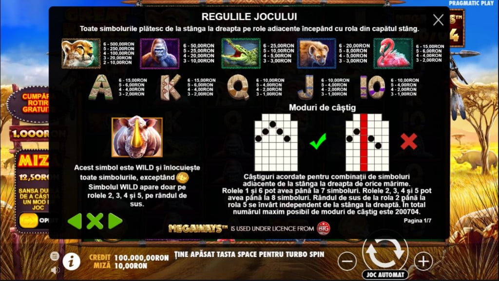 Great Rhino (cel original) e printre jocurile Pragmatic care dau bani cu grămada. Versiunea Megaways vine tot cu câștiguri mari și păstrează cam toate elementele cheie din slotul original.