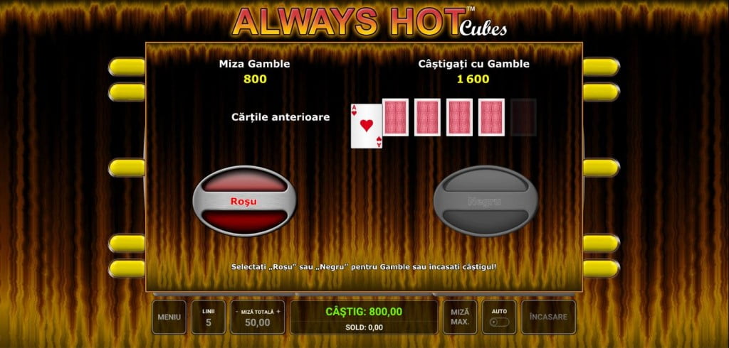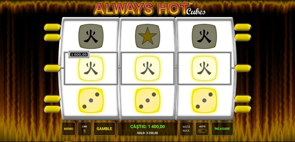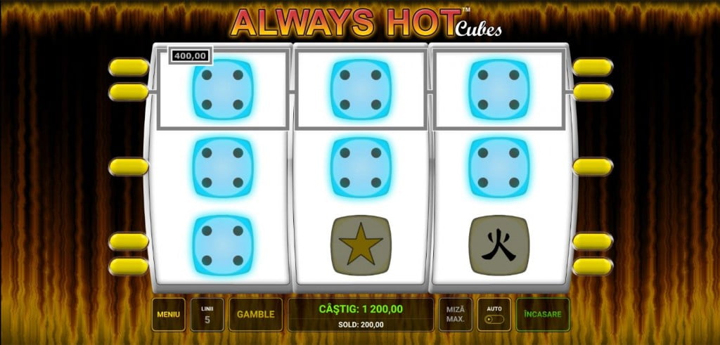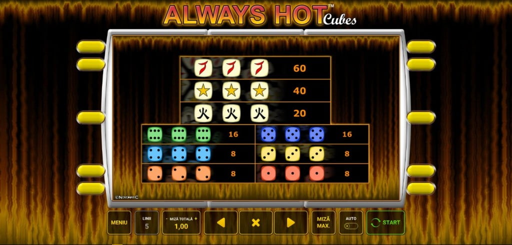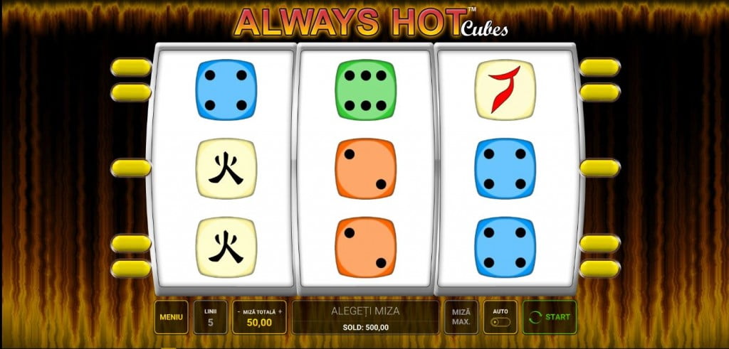 Always Hot Cubes e un fel de barbut al jocurilor de aparate, unde speri să vină cele mai mari zaruri și cât mai multe triple, în loc de duble.