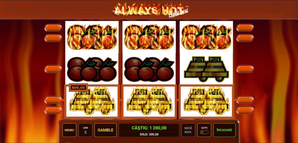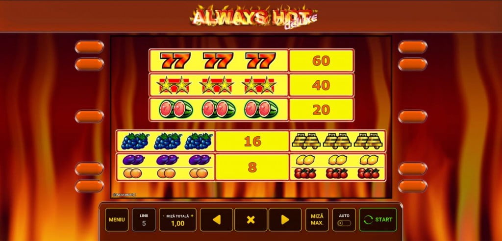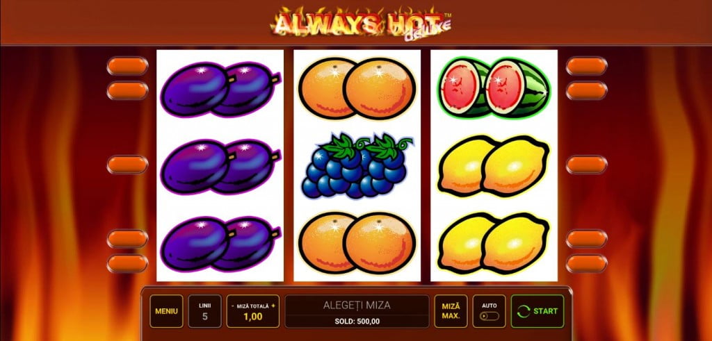 Always Hot Deluxe de la Novomatic e super simplu, un joc ideal pentru începători. Fructe, dublaje, puține linii, câștiguri mari.